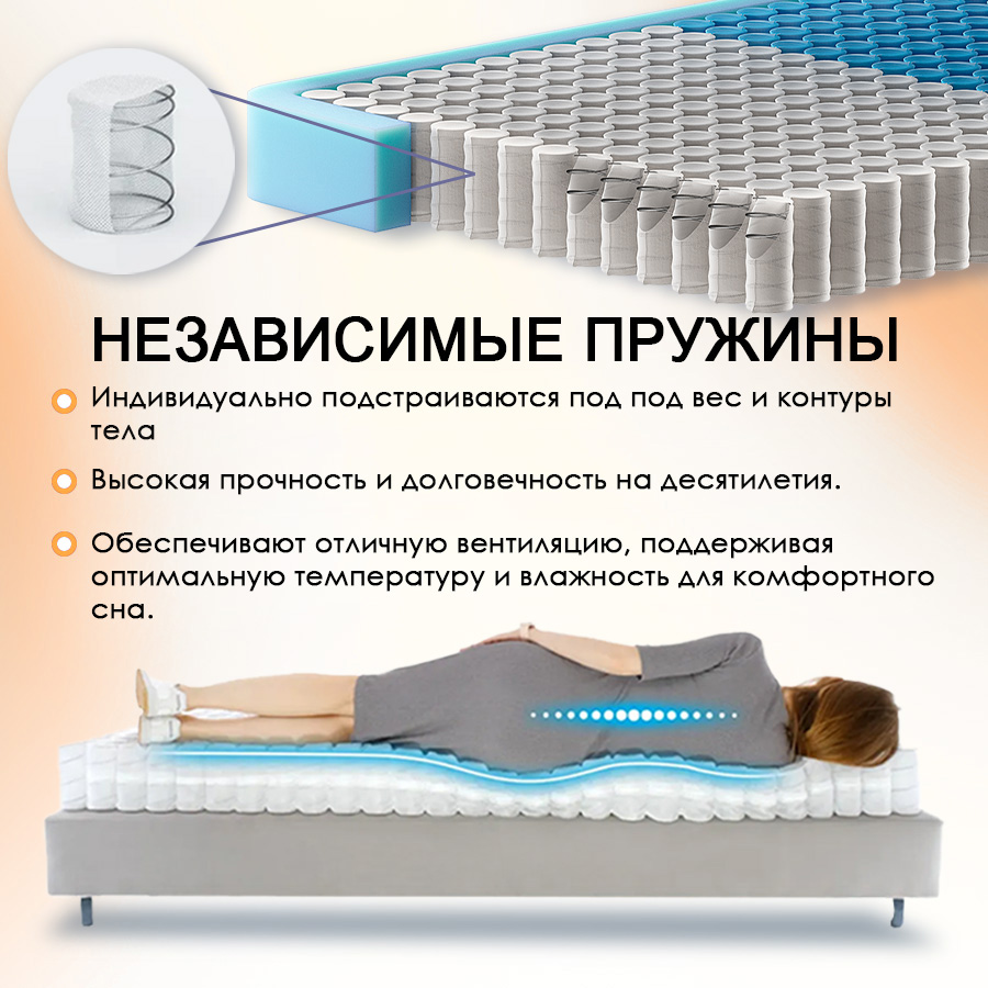 • Блок независимых пружин: Повышенная прочность и точечная поддержка позвоночника в анатомически правильном положении гарантируют долговечность матраса.