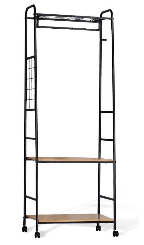 Конструкция включает в себя подставку для обуви, полку для аксессуаров и штангу для вешал. А опоры с колесиками позволяют с максимальным удобством перемещать вешалку по полу.