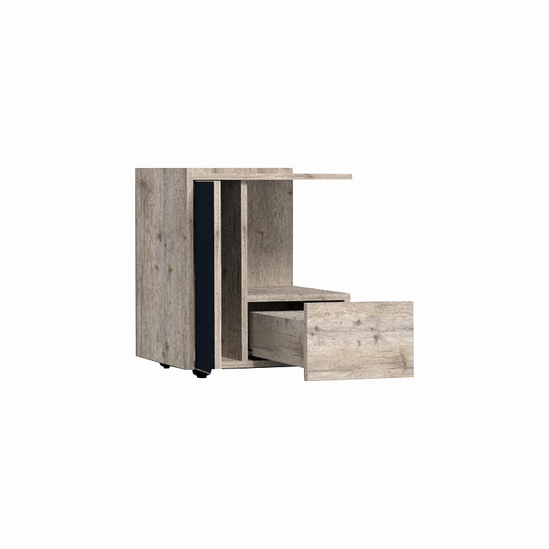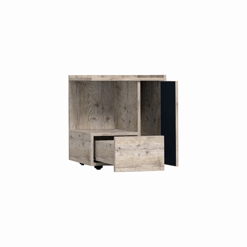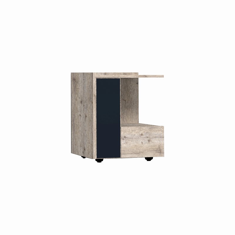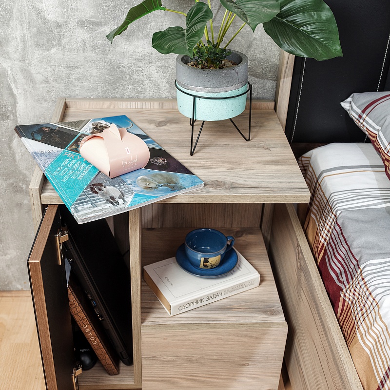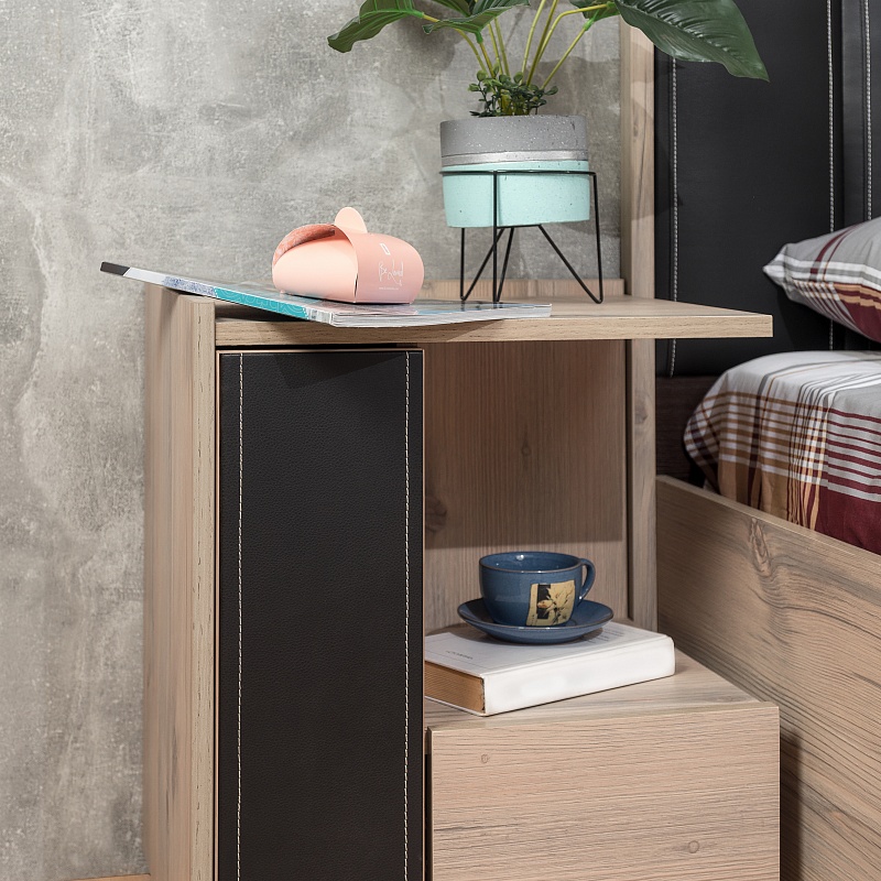 Прикроватная Тумба Nature 42 объединяет в себе естественность декора, удобство и практичность. Оригинальные вставки из экокожи черного цвета добавляют элегантности. А универсальная конструкция с открытой полкой, выдвижным ящиком и нишей с дверью на петлях отлично справляется с функцией аккуратного хранения вещей.