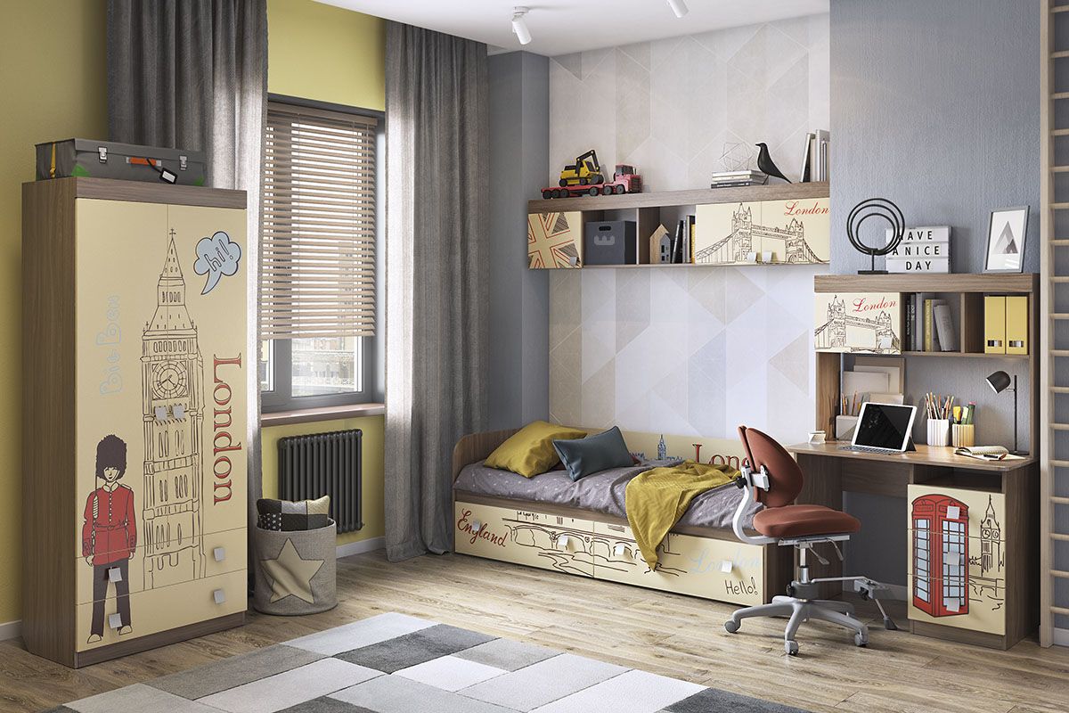 Стильная навесная полка «Челси» – мечта каждого мальчика. В закрытые шкафы и открытые ниши поместятся все учебники книги и сувениры. Эффектный принтерный рисунок на фасадах выдержан в общем стилистическом решении. Рисунок устойчив к истиранию и ультрафиолету. Детская «Челси»- все, что нужно для истинного джентльмена!