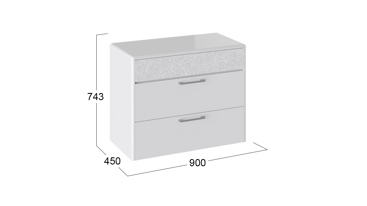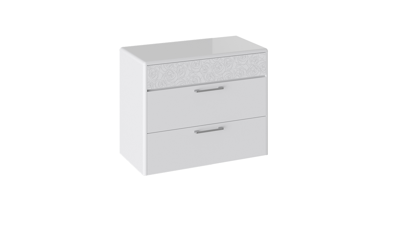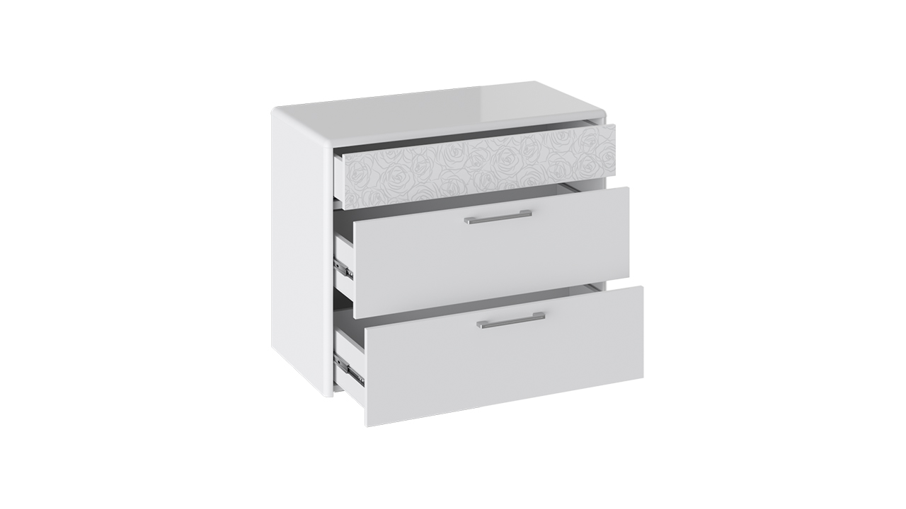 Белый компактный комод с тремя вместительными выдвижными ящиками. Верхний ящик, украшенный узорным рисунком, подходит для хранения разнообразных мелочей и аксессуаров. Хранить одежду, постельное белье и другие объемные вещи удобно хранить в двух других выдвижных ящиках.