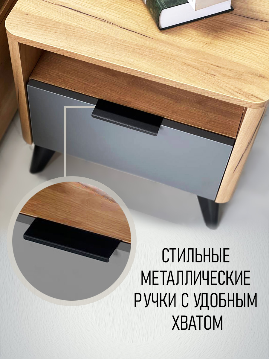 Прикроватная тумба «Адам» — это стильное и продуманное решение для современной спальни. Модель сочетает в себе эргономичный дизайн, безопасность и функциональность. Контрастное сочетание цветов «дуб крафт золотой» и «графит серый» добавляет интерьеру выразительности, а продуманные детали делают использование максимально комфортным.