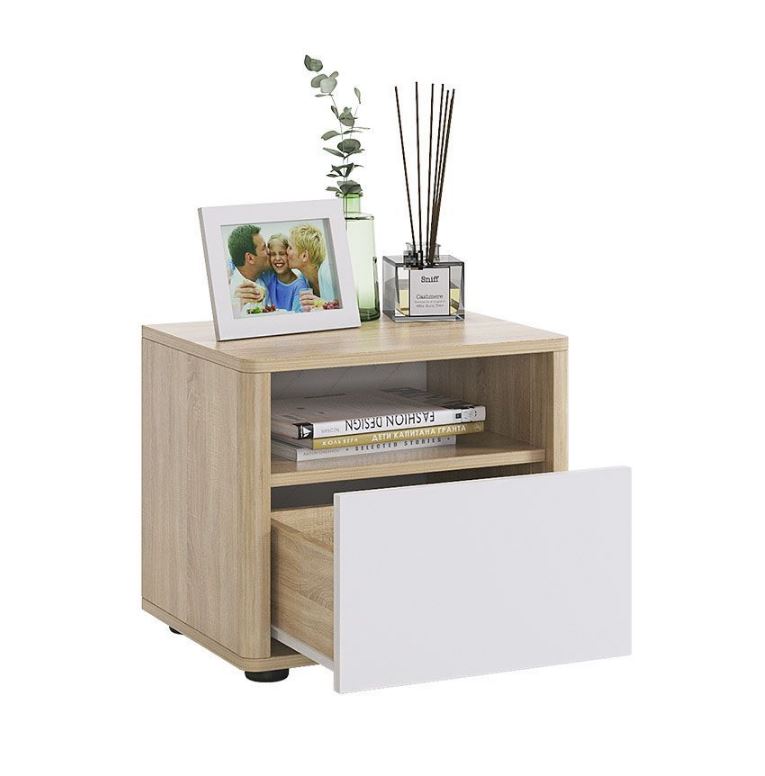 Прикроватная тумба «Зара» дополнит Ваш интерьер и прекрасно подойдет для хранения самых необходимых вещей как в открытой нише, так и в закрытом выдвижном ящике. Отличительной особенностью данной серии являются закругленные углы, которые обеспечат максимальную безопасность в использовании изделий.